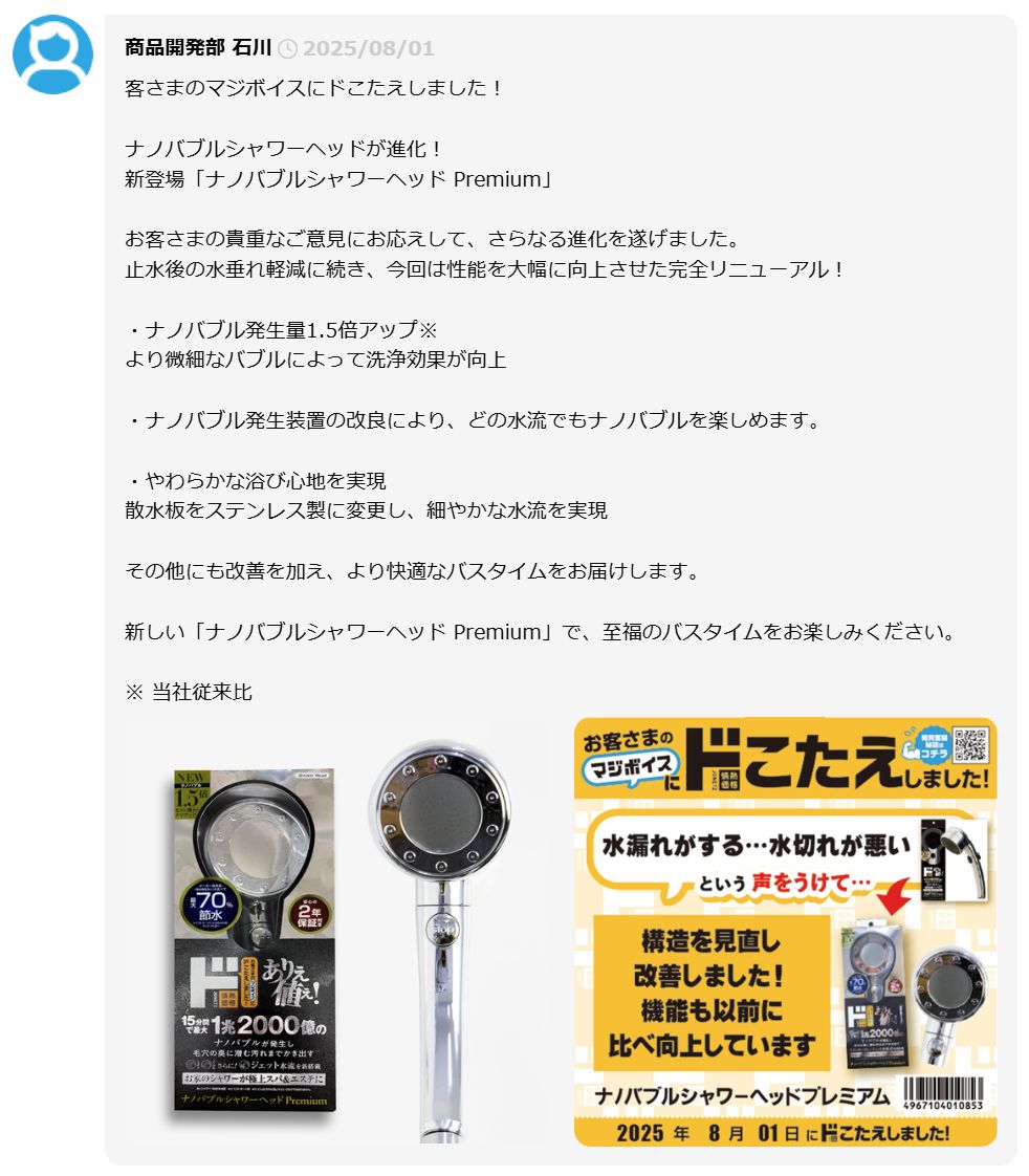 例えばこちら。「水を止めてもポタポタ垂れる」というお客様の声にお応えして商品を改善しつつ、更に大幅に機能を向上させたもの。っていうかこのシャワーヘッド欲しいんだけど。ナノバブルが発生するシャワーヘッド、普通に買うと高いから安い値段で買えるのはめちゃめちゃありがたい!