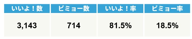 「いいよ!」率が81.5%とかなり高い数字です。人の主観・好き嫌いも影響する食べ物のジャンルでこれだけ高い評価が出るのはけっこうすごい事だなと思っています。リピート購入率の割合もかなり高いです。