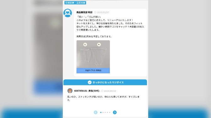例えばこちら。シンクの水切りネットですが、「浅い!」「ゴムが弱い!」というお客様の声にしたがって深いタイプにリニューアルしたもの。
