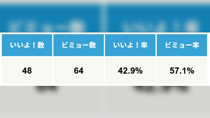 まず、「いいよ!」ですが残念ながら「ビミョー」が先行してしまっており、いいよ率42.9%と低い数字になってしまっております。