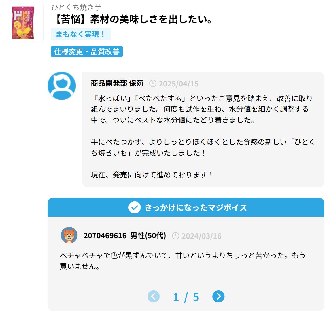 例えばこちら。「ひとくち焼き芋」の「ベチャベチャする」というお客様の声に対し、水分値を調整して改善をお約束したもの!
